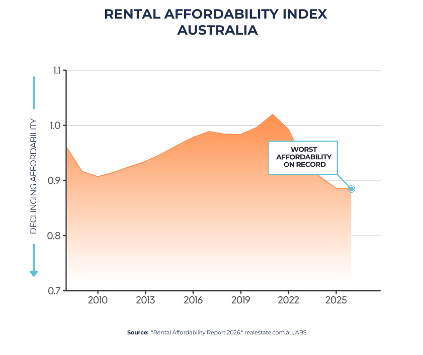Rental affordability is now at its lowest level since at least 2008, according to realestate.com.au.